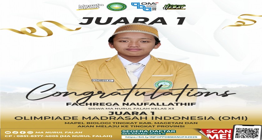 Prestasi membanggakan kembali diraih oleh salah satu siswa terbaik MA Nurul Falah, yaitu Fachrega Naufallathif dari kelas X3. Ia berhasil meraih Juara 1 Olimpiade Madrasah Indonesia (OMI) bidang Biologi tingkat Kabupaten Magetan 2025.