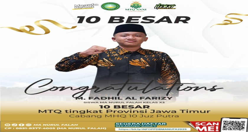 Sebuah kebanggaan kembali diraih oleh siswa MA Nurul Falah. Kali ini, prestasi datang dari M. Fadhil Al Farizy, siswa kelas X3, yang berhasil masuk 10 Besar Musabaqah Tilawatil Qur’an (MTQ) tingkat Provinsi Jawa Timur pada cabang Musabaqah Hifdzil Qur’an (MHQ) 10 Juz Putra.